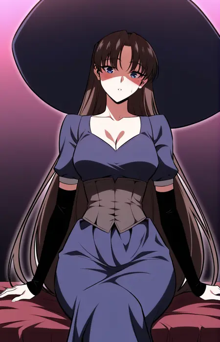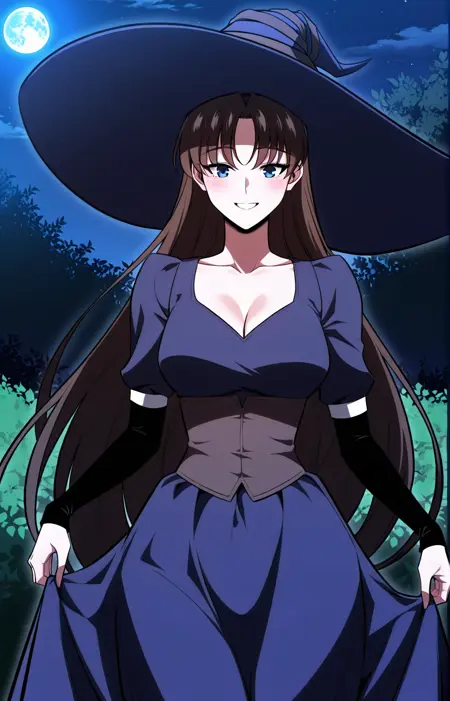 Deyna, 1 girl, solo, long hair, brown hair, straight hair, straight bangs, full bangs, blue eyes, witch hat,