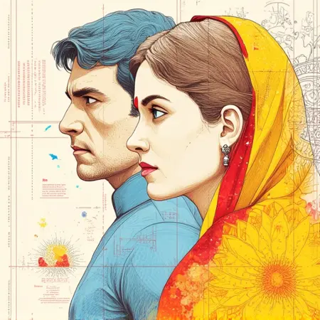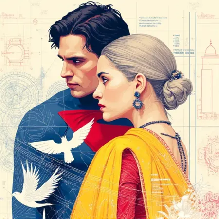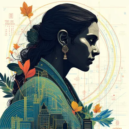 폐허 중에 서 있는 여신 같은 여성. 그녀의 사리는 CAD로 시뮬레이션된 바람에 날리며, 계획된 소용돌이 선과 중력장이 고대 석재 위에 오버레이된다. 날아가는 벡터 새들이 그녀 뒤의 태양광 도면을 따라 호를 그리며, 우아함과 붕괴된 건축물을 꿈같은 정밀도로 결합한다.