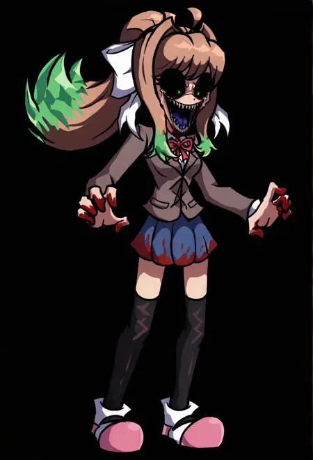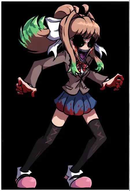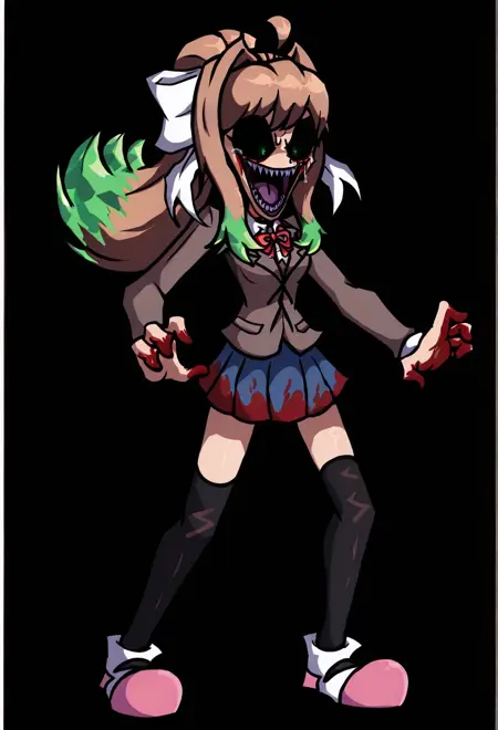AsmodeusChrP3, 1girl, green eyes, black sclera, blood on skirt, long light brown hair, desaturated purple-brown blazer, blue skirt, black high socks, white head bow, Pink-white shoes, horror, red neck ribbon, blunt bags, sidelocks, green crystals on hair, sharp teeth, purple tongue, bloody tears,