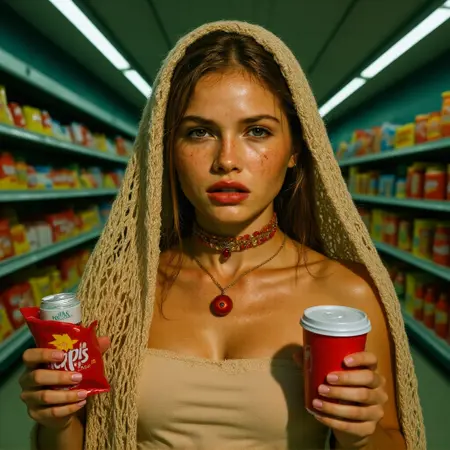 3- 一张超真实的人像,展现一位容貌惊艳的女性,拥有迷人榛绿色双眼与自然雀斑,以业余摄影的随意、笨拙风格拍摄于深夜明亮而冰冷的 24 小时便利店内。照片从低角度拍摄,仿佛由一位意外捕捉到她的朋友所拍。主要光源是刺眼的绿色调顶灯,导致她的眼下和下巴形成深而难看的阴影,使皮肤显得苍白。她站在货架间,一手拿着薯片袋,另一手握着汽水,抬头看向镜头,表情略带不耐烦,仿佛在说:“你真的现在要拍照吗?”她身着简单的 T 恤,披着那条纤细的米色钩针网纱披肩,与周围五颜六色的零食包装形成强烈违和。她标志性的红橙色珠串项圈和金质吊坠,与这平庸的环境格格不入。构图偏离中心,色彩因灯光糟糕而褪色。氛围是突兀而真实的日常感。