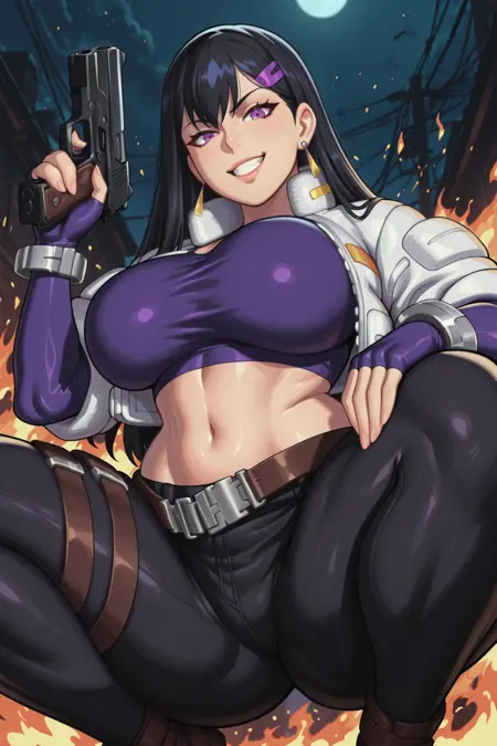 • 触发词:zackletu,长发,黑发,发夹,紫色眼睛,高领,短款夹克,敞开式夹克,紫色短上衣,紫色肘套,露指手套,灰色手环,露腹,黑色长裤,(松垮腰带:1.3),棕色腰带,腰扣,棕色大腿带,灰色鞋履
