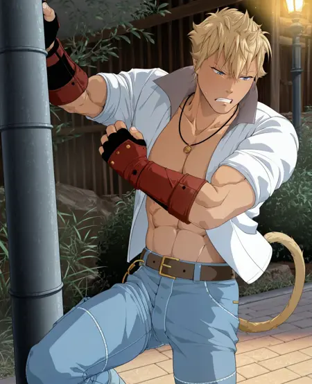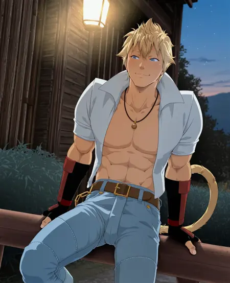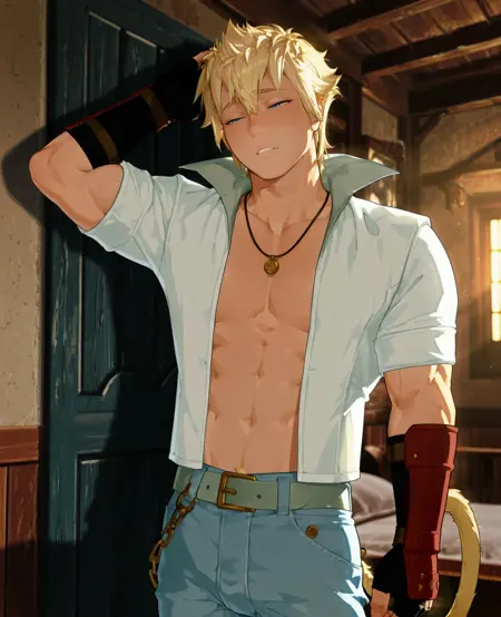 服装: 红色手套,露指手套,白色衬衫,敞开式衬衫,腰带,牛仔裤,黄色鞋子