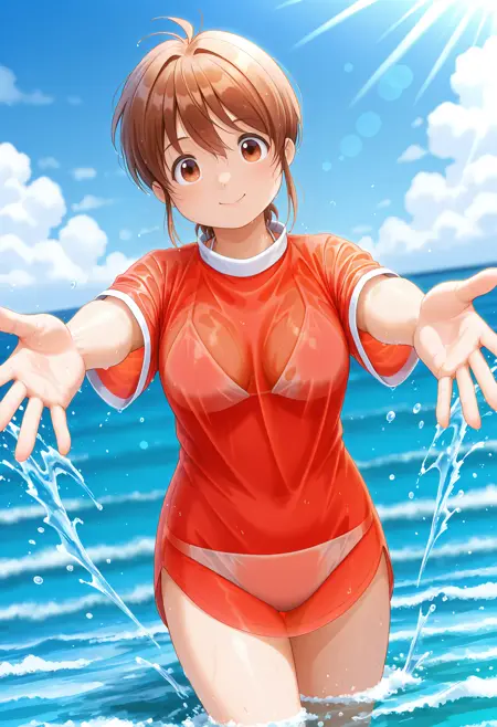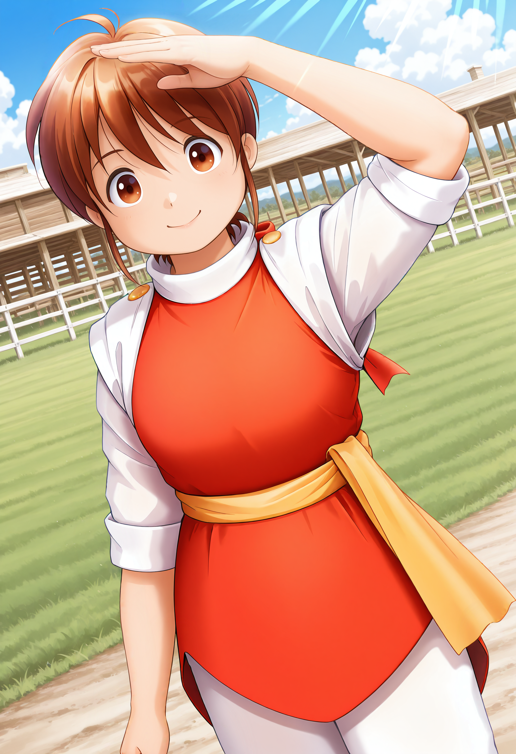 #1: 赤いチュニック、白いアンダーシャツ、長袖、袖をめくった状態、赤い背中のリボン、黄色い腰帯、白いズボン、茶色のブーツ