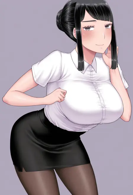 衣装: 白シャツ, ドレスシャツ, 短袖, ペンシルスカート, パンティーハイズ,