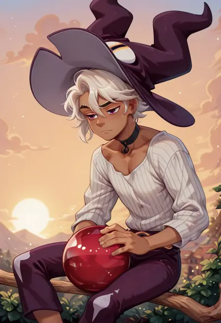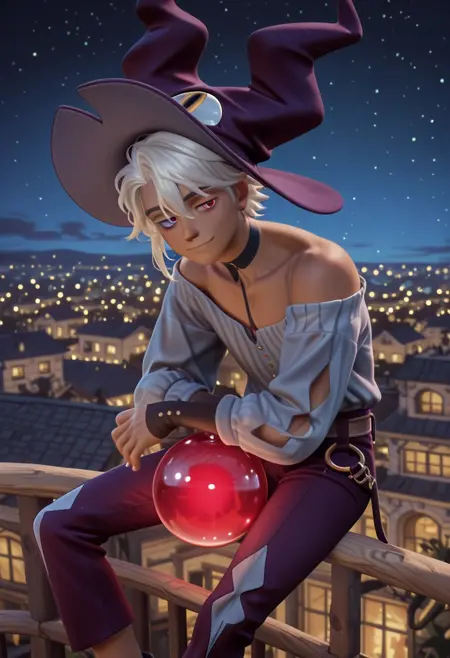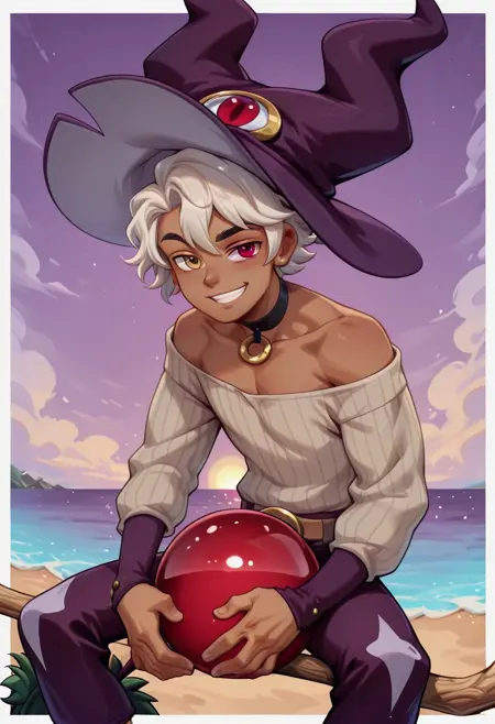 クイン、ポーションミクス、肌の黒い男性、暗い肌、白い髪、短い髪、虹彩異色症、赤い目、黄色い目、にやりと笑う、笑顔、二角帽、大きな魔女帽、帽に目がある、縞模様の白いシャツ、肩出しシャツ、長袖、紫のズボン、肩を露出、アクセサリー、チョーカー、赤いガラスの球、箒、球を握っている