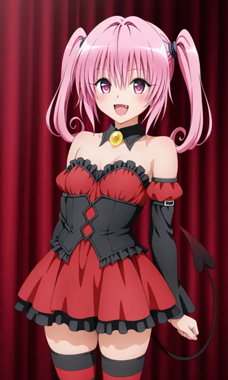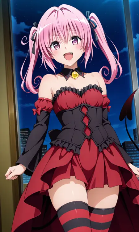ナナ・アスタ・デビルューク(ト・ラ・ル全シリーズ)、犬歯、長い髪、ピンクの目、ピンクの髪、悪魔の尾、ツインテール、成熟した女性、小胸、太もも、外したカラーや、裸の肩、赤いドレス、多色使いの服、外した袖、縞模様のハイレグ、ヘアリボン