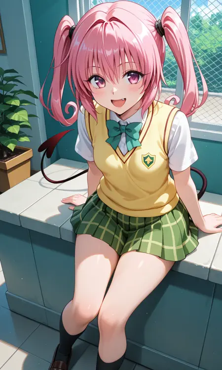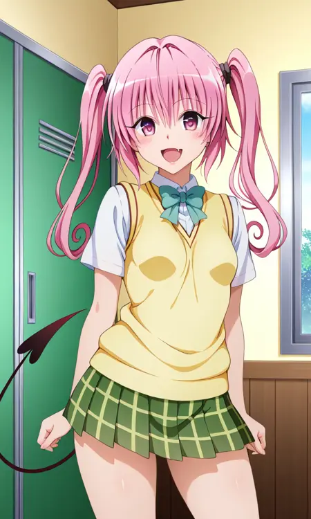 ナナ・アスタ・デビルューク(ト・ラ・ル全シリーズ)、犬歯、長い髪、ピンクの目、ピンクの髪、悪魔の尾、ツインテール、成熟した女性、小胸、太もも、緑のスカート、チェック柄、チェック柄のスカート、西南高校の制服、学校制服、スカート、シャツ、白いシャツ、セーターのベスト、黄色いセーターのベスト