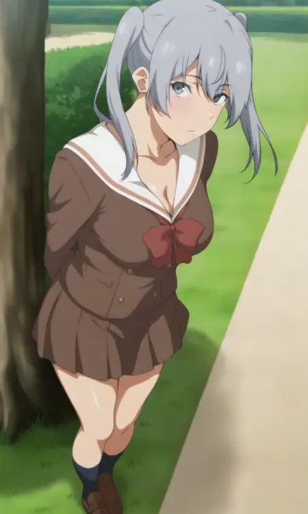 1girl, solo, kurore, grey hair, pigtails, schoolgirl uniform, blue swimsuit