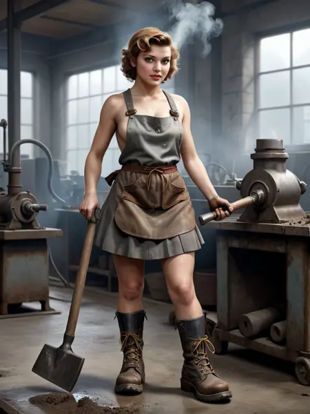 레트로 스타일의 산업 환경에 초점을 맞춘 모델. 기계 뒤에서 열심히 일하는 여성들. 과거의 시대를 묘사하며 오래된 사진들로 학습되었습니다.