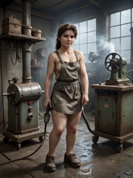 レトロなスタイルの工業環境に焦点を当てたモデル。機械の背後に働く女性たち。過去の時代を描き、古い写真で学習されています。