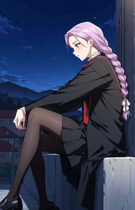 Maria, 1 girl, solo, light purple hair, center parted hair, braided ponytail, amber eyes,