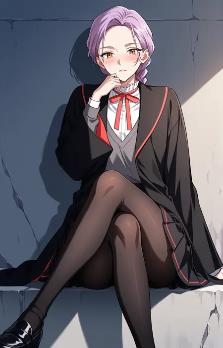 Maria_outfit, black school uniform, long coat, red trim, black coat, red inner coat, black pleated skirt, grey sweater, white shirt, red ribbon bow, long pleated black skirt, black tights, black loafers, school emblem