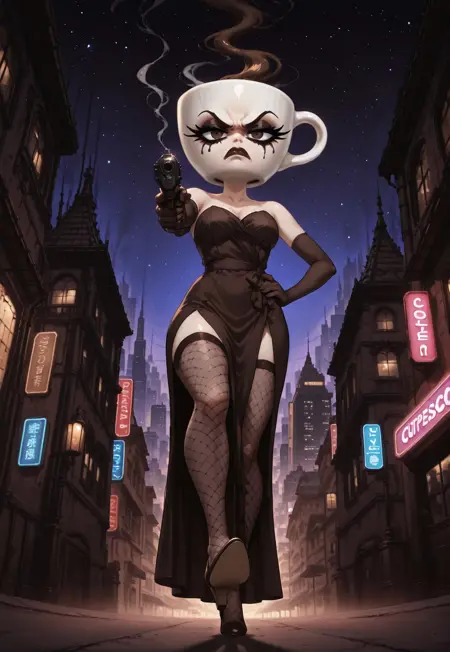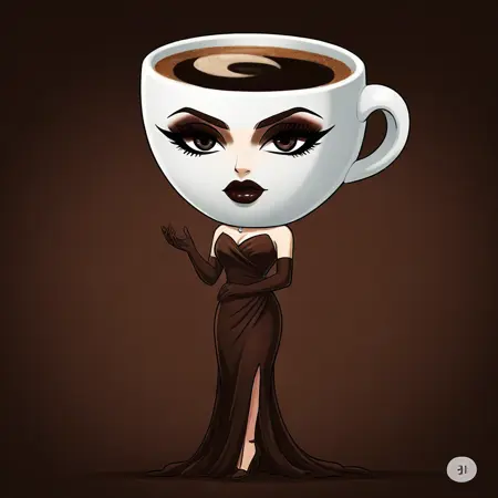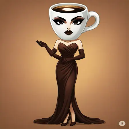 | 训练词汇 | expressona signora, object_head, white coffee cup head, heavy dark makeup, eye makeup, eyeliner, mascara, dark smoky brown eyeshadow, long eyelashes, detailed lips, dark brown lipstick, eyebrows, dark brown strapless sleeveless evening gown, dark brown elbow gloves, dark brown heels已复制! |