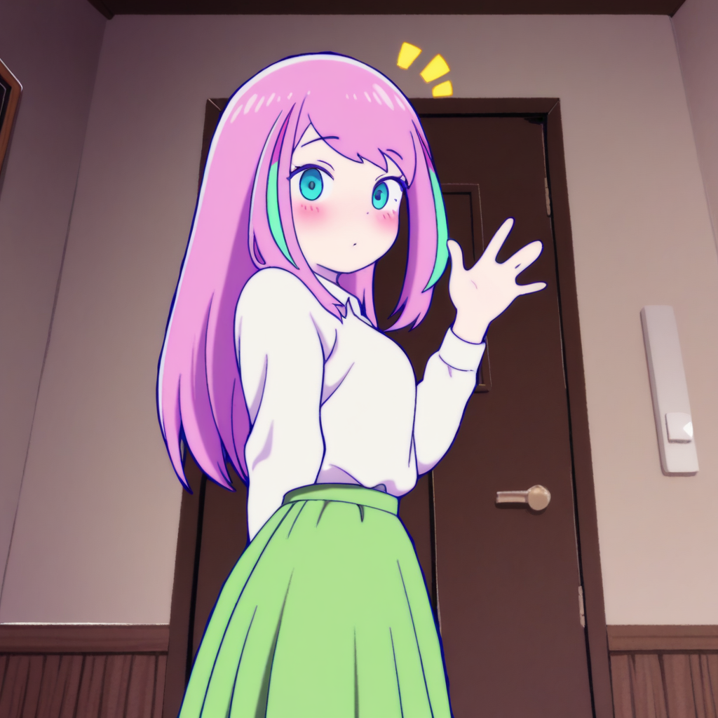 1girl, streaked hair, multicolored hair, pink hair, solo, skirt, aqua eyes, long hair, indoors, nydressup, green skirt,