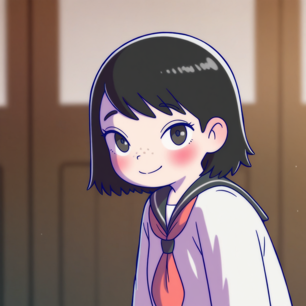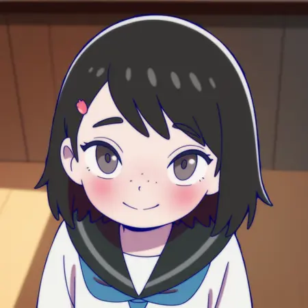 ny@@18, 1girl, school uniform, serafuku, short hair, black hair, light freckles, hair ornament,
