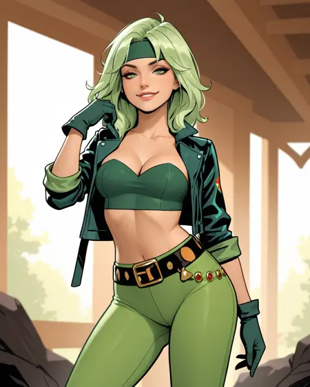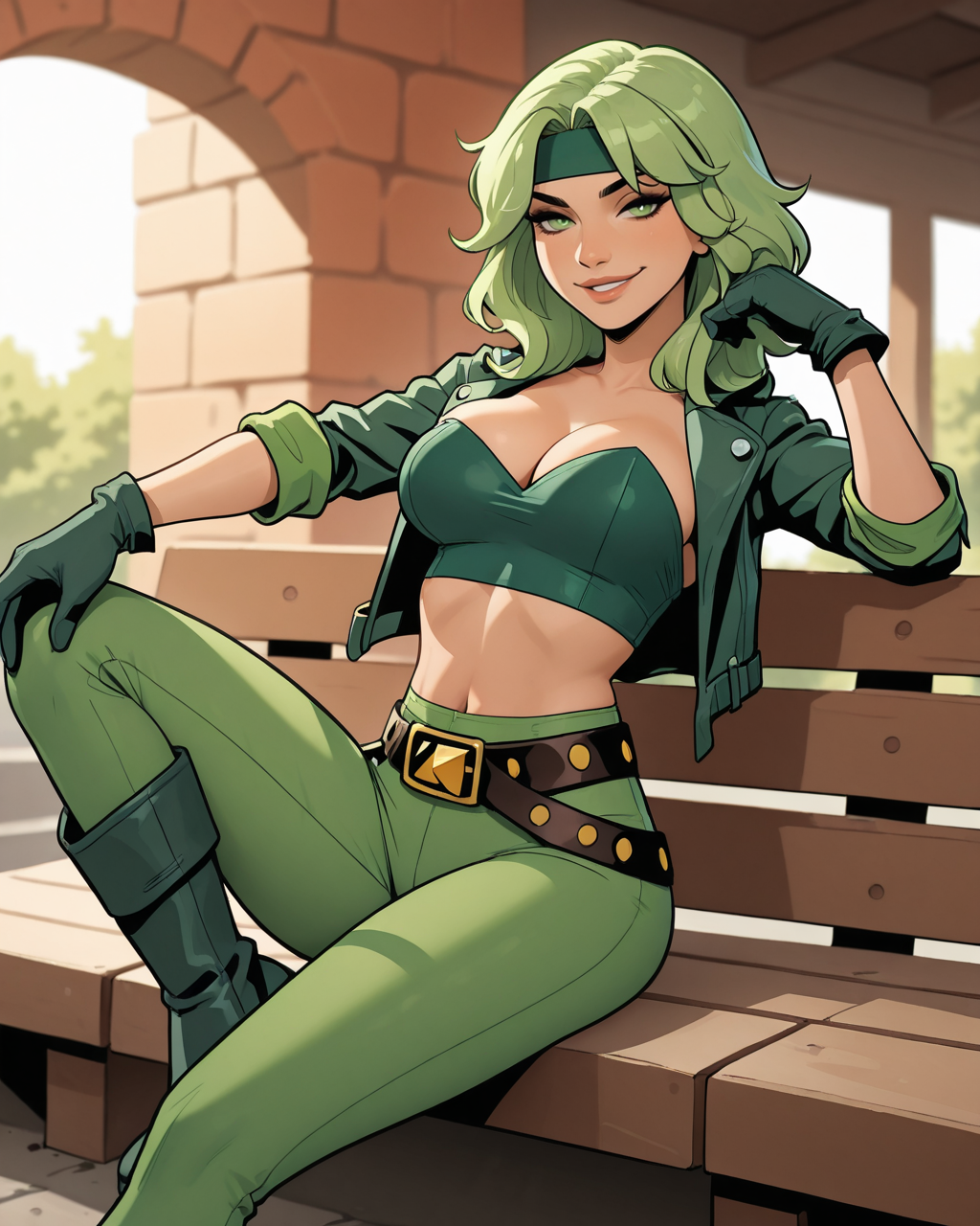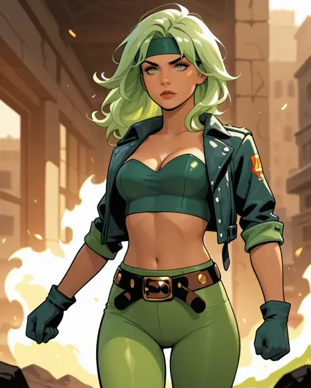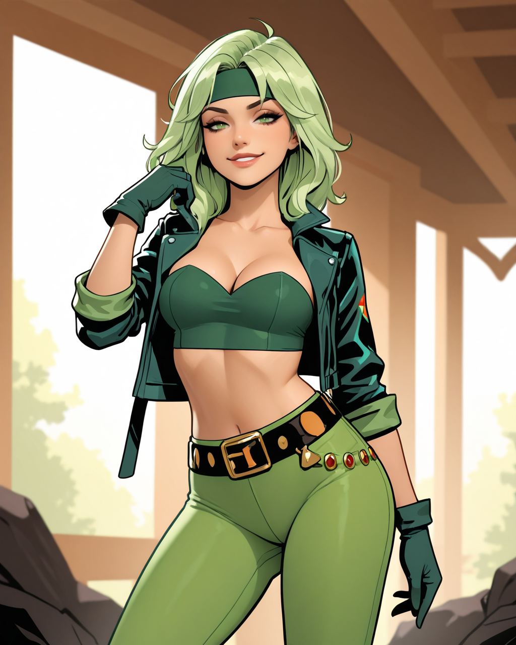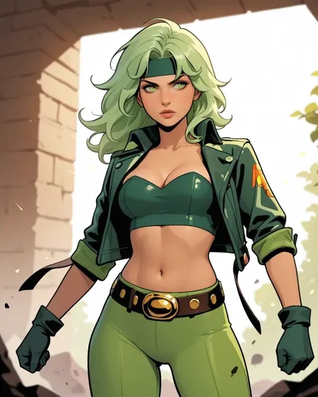 普通外观:beatrizfire, 1girl, 绿发, 绿眼, 头带, 露脐上衣, 无肩带, 露腹, 手套, 裤子, 皮带, 外套, 乳沟
