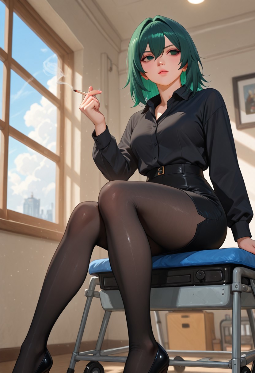 <lora:yoonda cha-v1>,stop smoking, Green eyes, Green hair, long hair,bangs,hair between eyes, big breasts