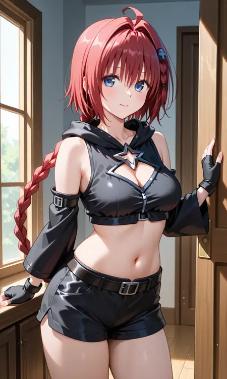 쿠로사키 메아 (투 러 루 전체 시리즈), 아호게, 파란 눈, 땋은 머리, 머리 삽입부, 머리 장식, 긴 머리, 빨간 머리, 땋은 머리, 성숙한 여성, 중간 크기 가슴, 허벅지, 어깨 노출, 검은 장갑, 검은 셔츠, 검은 반바지, 검은 소매, 젖가슴, 젖가슴 절개, 옷 절개, collarbone, 크롭 탑, 분리된 소매, 손가락 없음 장갑, 장갑, 눈 사이 머리카락, 후드, 후드 내려짐