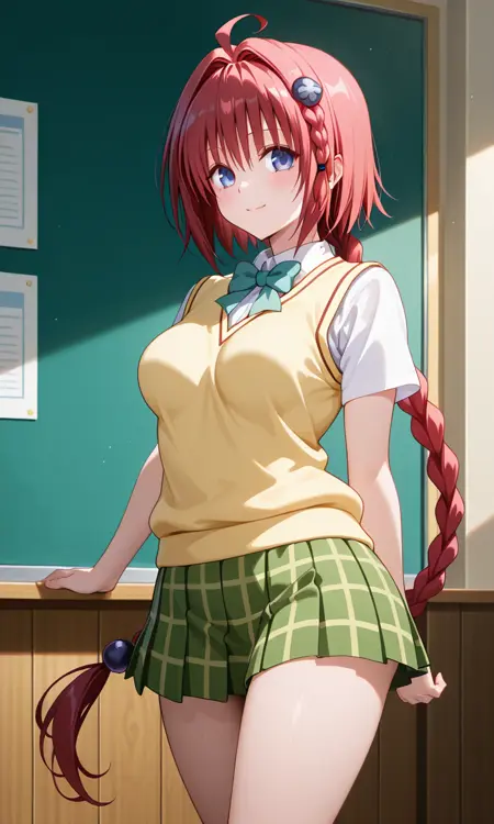 쿠로사키 메아 (투 러 루 전체 시리즈), 아호게, 파란 눈, 땋은 머리, 머리 삽입부, 머리 장식, 긴 머리, 빨간 머리, 땋은 머리, 성숙한 여성, 중간 크기 가슴, 허벅지, 녹색 스커트, 체크무늬, 체크무늬 스커트, 사이난 고등학교 유니폼, 학교 유니폼, 스커트, 셔츠, 흰색 셔츠, 스웨터 조끼, 노란색 스웨터 조끼