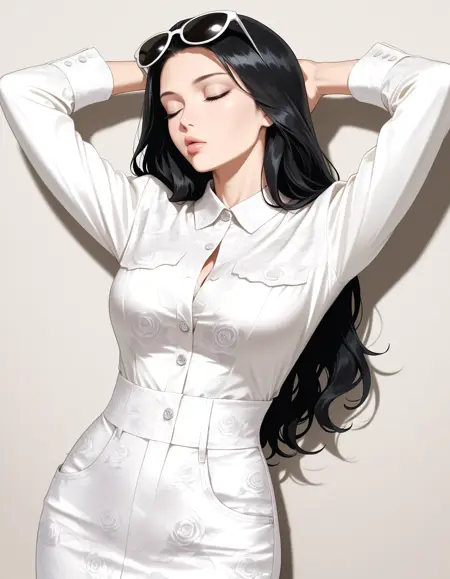 学習に使用:黒いドレス、白い模様の服、ポケット、ボタン、白い縁取り、ポケット