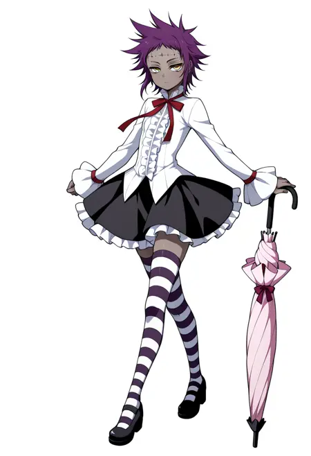 白いドレス、腕リボン、裂けたパンスト、紫のリボン、マリー・ジェーン靴、ポンポンシューズ