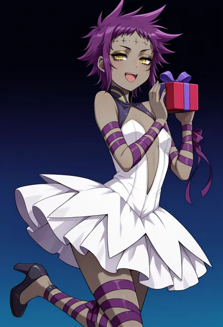 黄色い目、紫の髪、青い髪、肌の黒い女性、暗い肌、白い肌、短い髪、とげとげした髪、小さい胸