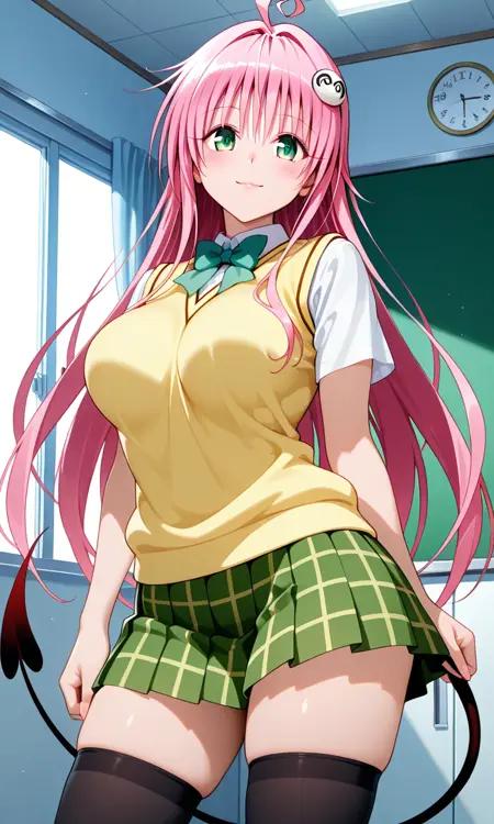 ララ・サタリン・デビルューク(ト・ラブ・ル オールシリーズ)、長い髪、ピンクの髪、尾、アホ毛、前髪、髪飾り、緑の目、悪魔の尾、成熟した女性、大きな胸、太もも、緑のスカート、チェック柄、チェック柄のスカート、西南高校の制服、学校uniform、スカート、セーターのベスト、タイツ、黄色いセーター、短い袖、リボン、緑のリボン