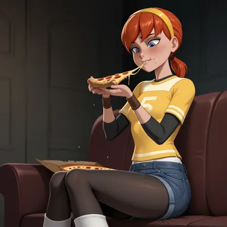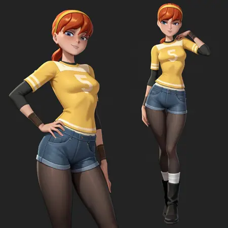 プロンプト: アプライル・オニール、オレンジ色の髪、ポニーテール、ヘアバンド、青い目、ほくろ、黄色のシャツ、黒のアンダーシャツ、リストバンド、デニムのショートパンツ、パンツィース、白い靴下、ブーツ