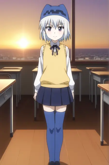 blue beanie, yellow sweater vest, long sleeves, skirt, blue thighhighs,