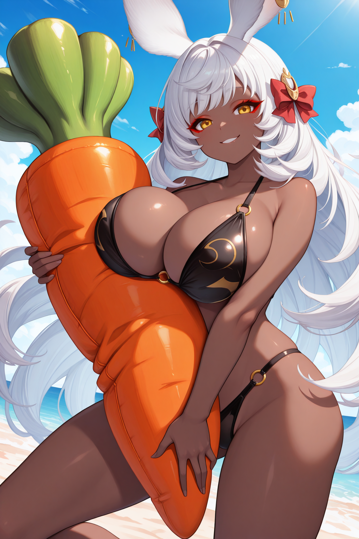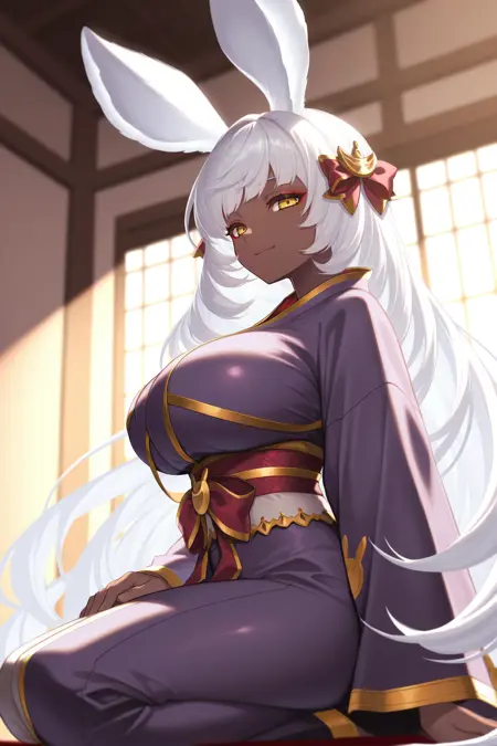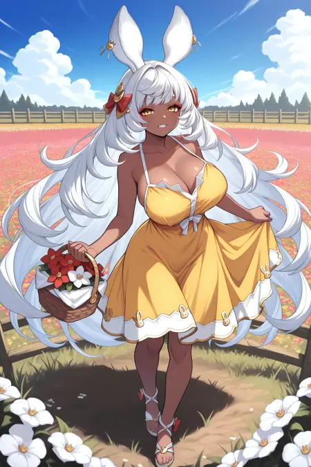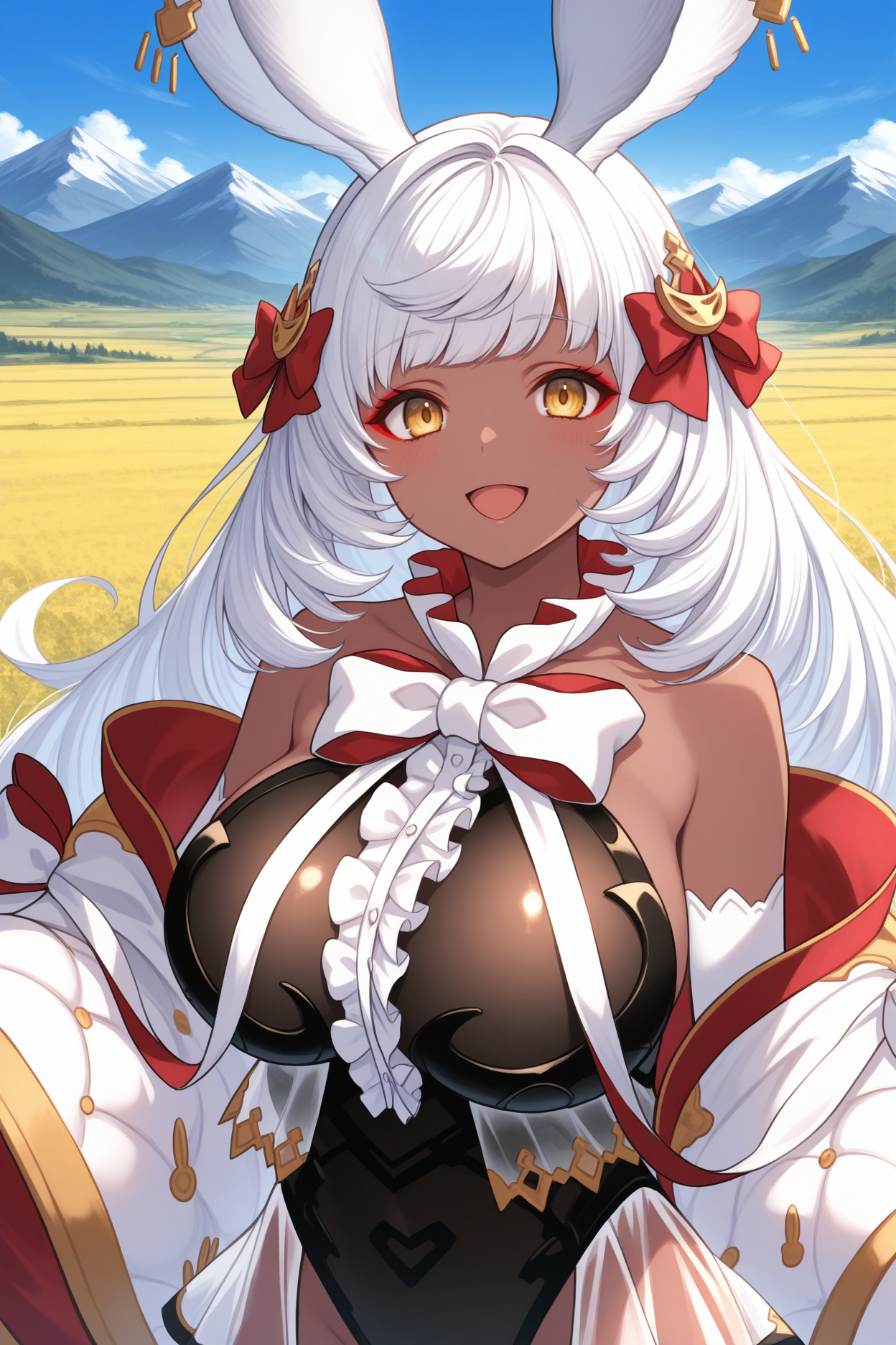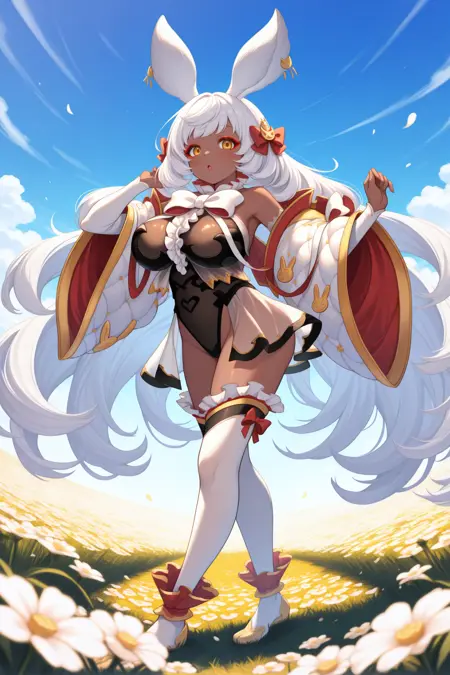 使用“defmu, 兔耳朵, 深色皮肤女性, 白发, 超长发, 黄眼睛, 红眼线, 发饰蝴蝶结, 黑色紧身衣, 分离袖子, 宽袖, 白色蝴蝶结领结, 中间荷叶边, 闪亮裙装, 透视裙摆, 白色过膝袜, 荷叶边过膝袜”来呈现她的默认外观。