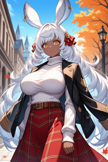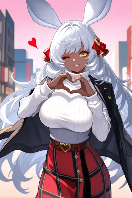 使用“vlnmu, 兔耳朵, 深色皮肤女性, 白发, 超长发, 黄眼睛, 红眼线, 发带, 红色丝带, 绞花毛衣, 白色毛衣, 高领, 黑色夹克, 夹克搭在肩上, 棕色腰带, 格子裙, 长裙, 红色裙子”来呈现她的情人节装扮。