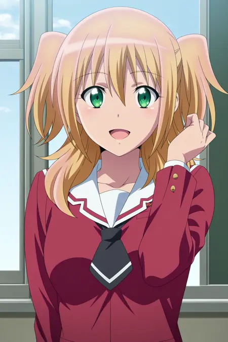 inoue narumi, medium hair, blonde hair, two side up, hair over shoulder, sidelocks, wispy bangs, green eyes, long sleeves, red jacket, white shirt, white sailor collar, black necktie, short necktie, red skirt, pleated skirt, striped skirt, white socks, kneehighs, brown footwear, loafers