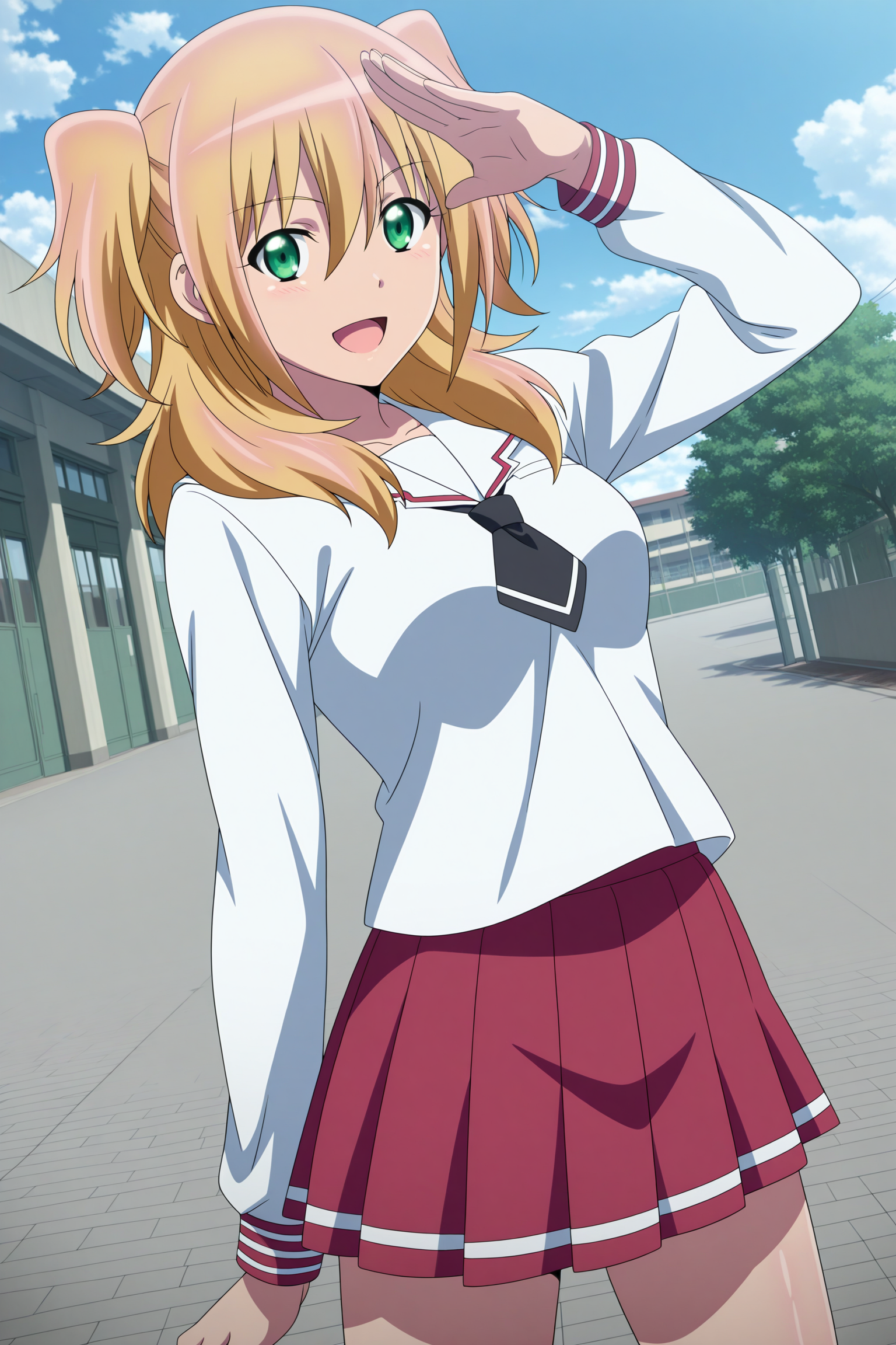 inoue narumi, medium hair, blonde hair, two side up, hair over shoulder, sidelocks, wispy bangs, green eyes, long sleeves, white shirt, white sailor collar, black necktie, short necktie, red skirt, pleated skirt, striped skirt, white socks, kneehighs, brown footwear, loafers