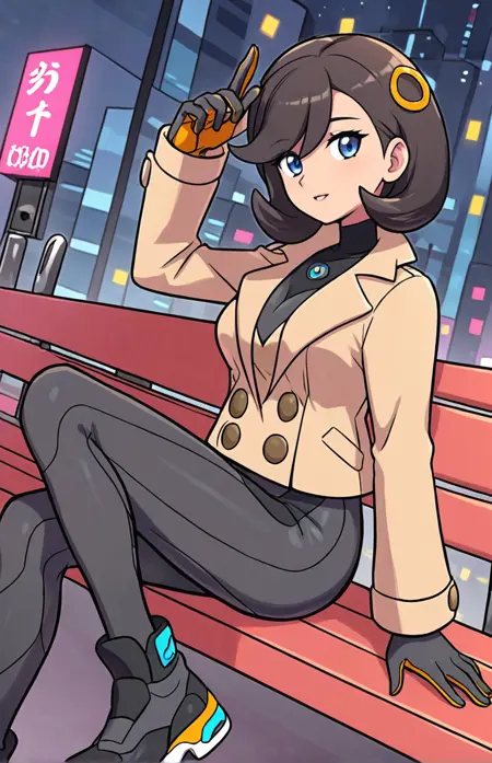 zaemma, blue eyes, black hair, short hair, swept bangs, cowlick, dark-skinned female, hair ornament, brown jacket, long sleeves, two-tone gloves, black gloves, orange gloves, bodysuit under clothes, black bodysuit, turtleneck, shoes, black footwear