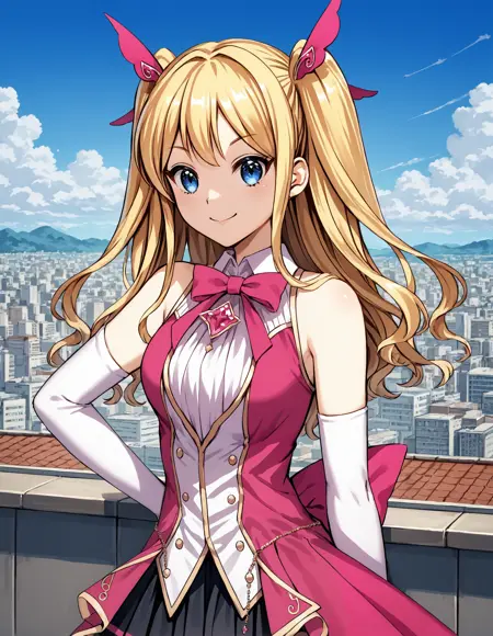 魔法服装: mgrcriaami, riamgc, 粉色发夹,白色无袖上衣,粉色蝴蝶结,粉色胸饰,粉红不对称荷叶边连衣裙,粉色背部蝴蝶结,白色肘部手套,[百褶黑色短裙],白色过膝袜,大腿绑带