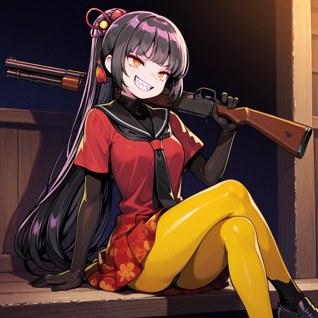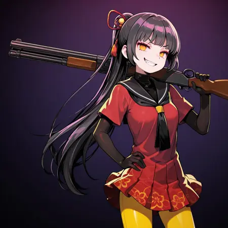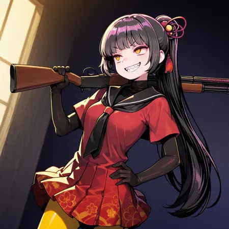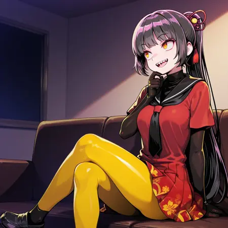 복장: 검은 셔츠, 빨간 드레스, 검은 해군 컬러, 검은 해군 넥타이, 긴 검은 장갑, 주름치마, 꽃무늬 치마, 노랑 레깅스, 검은 양말, 검은 로퍼,