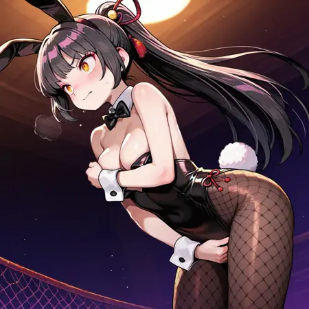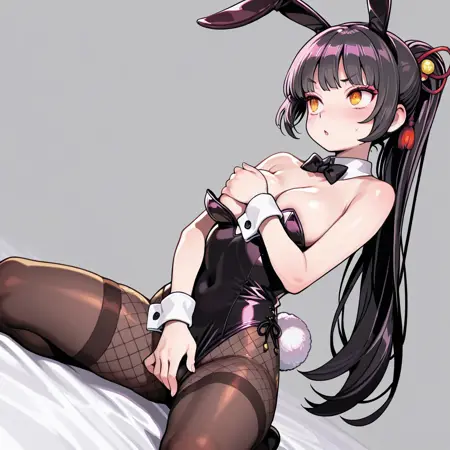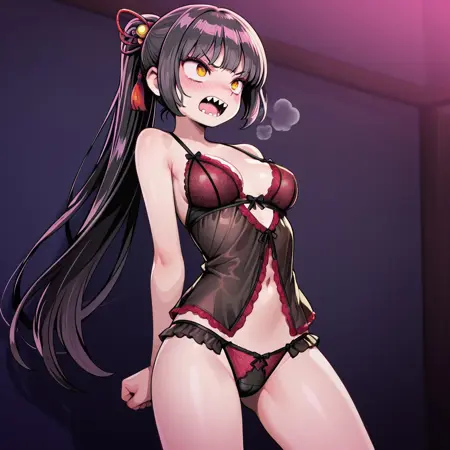 캐릭터: 1소녀, 검은 머리, 긴 머리, 팁테일, 머리 장식, 황갈색 눈, 붉은 속눈썹, 중간 크기 가슴,