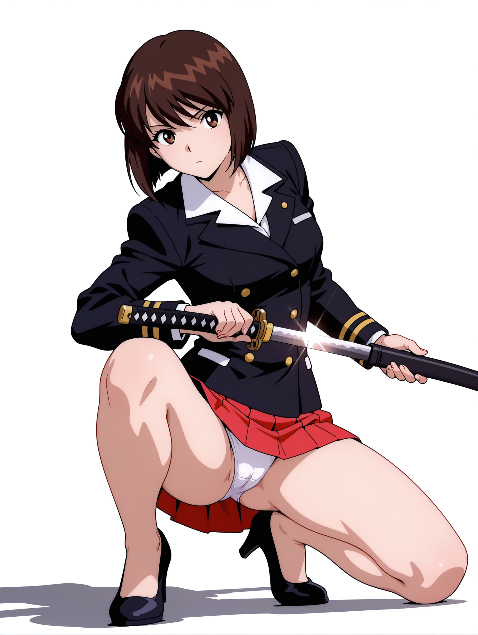복장 단어: e_clothes, black jacket, red pleated skirt, white underwear, black high heels,