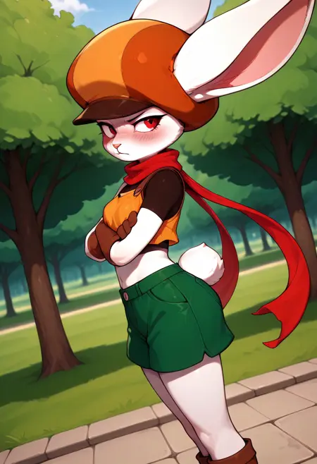cabbie hat, red scarf, crop top, green shorts, brown gloves, brown boots, ears through headwear