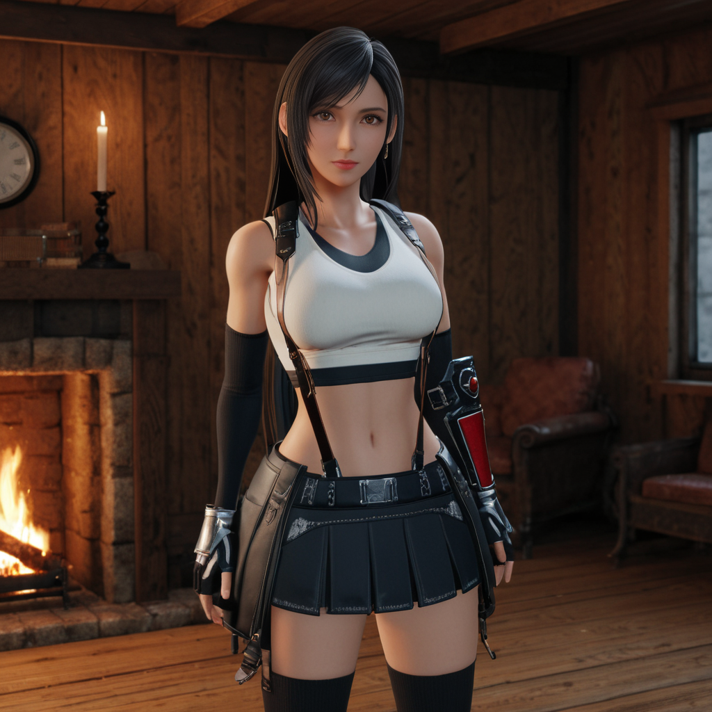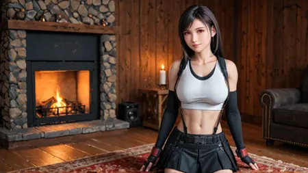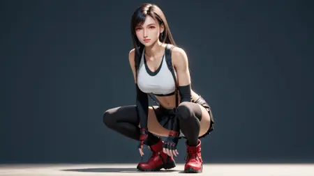 | 训练词汇 | tifa lockhart,red eyes,black hair,long hair,bangs,large breasts,black skirt,miniskirt,black thighhighs,pleated skirt,suspender skirt,suspenders,jewelry,bare shoulders,boots,red footwear,earrings,swept bangs,low-tied long hair,sleeveless,fingerless gloves,black gloves,elbow gloves,elbow pads,white tank top,crop top,black sports bra已复制! |