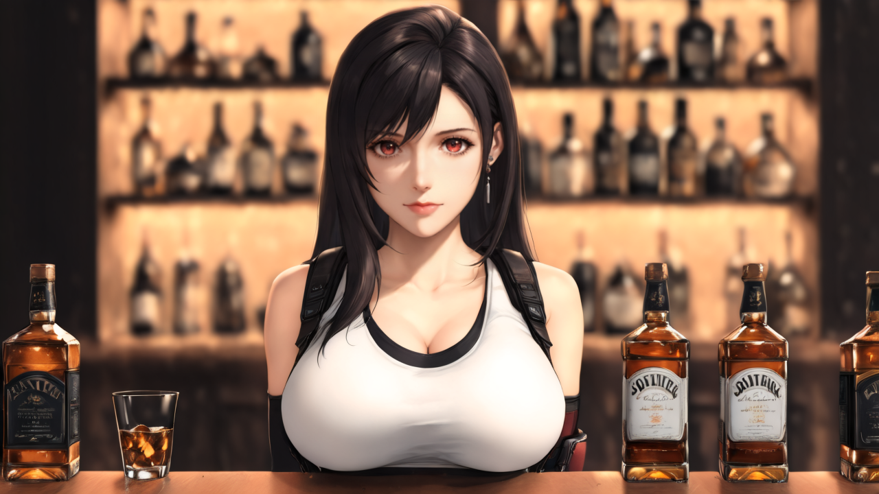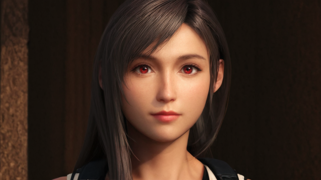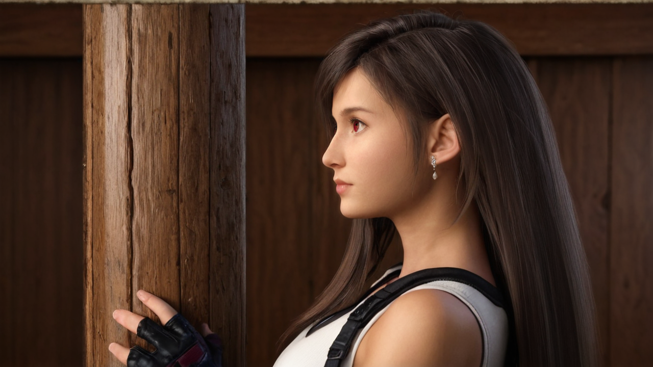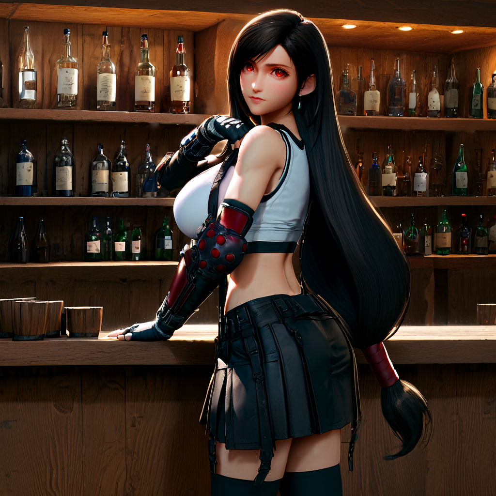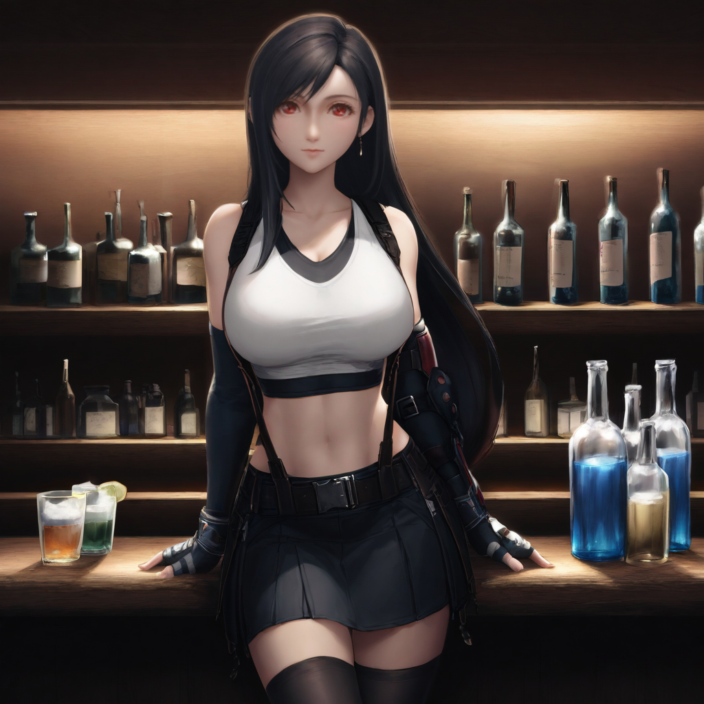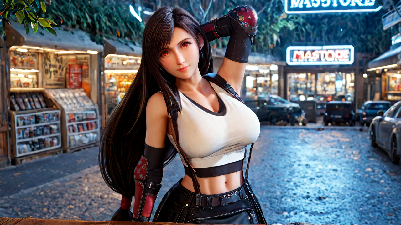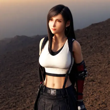 tifa lockhart,red eyes,black hair,long hair,bangs,large breasts,black skirt,miniskirt,black thighhighs,pleated skirt,suspender skirt,suspenders,jewelry,bare shoulders,boots,red footwear,earrings,swept bangs,low-tied long hair,sleeveless,fingerless gloves,black gloves,elbow gloves,elbow pads,white tank top,crop top,black sports bra