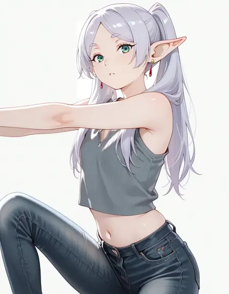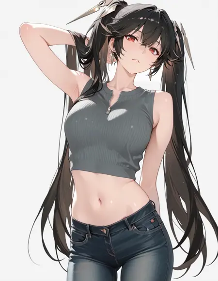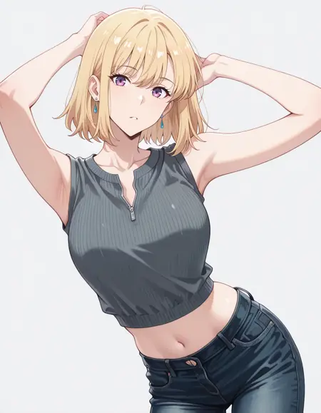 mai_bj_clothing_m_denim,sleeveless_shirt,grey_shirt,unzipped,crop_top,earrings,jeans