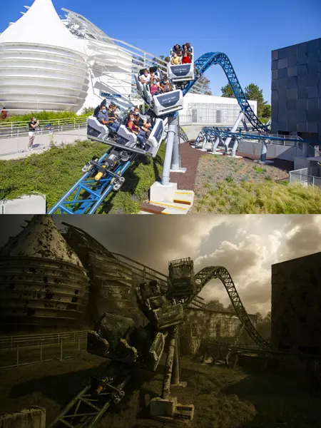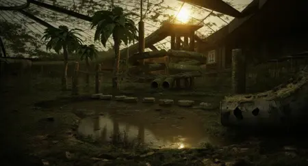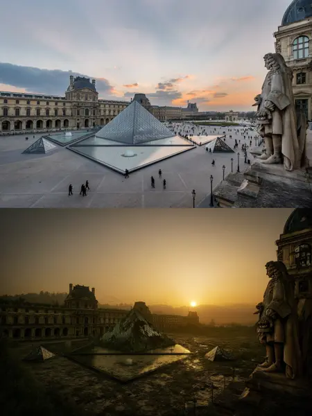 该模型将光影和色调转向赭石色、绿色或尘土般的去饱和色调,引入衰败、破坏以及自然重新夺回空间的元素——如断裂的结构、锈迹、泥浆或残骸。