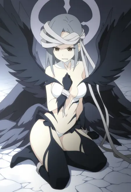 翅膀,肚脐,手套,黑色翅膀,黑色手套,光环,巨大光环,绷带,头部绷带,羽翼翅膀,多层翅膀,丝带,过膝袜,吊袜带