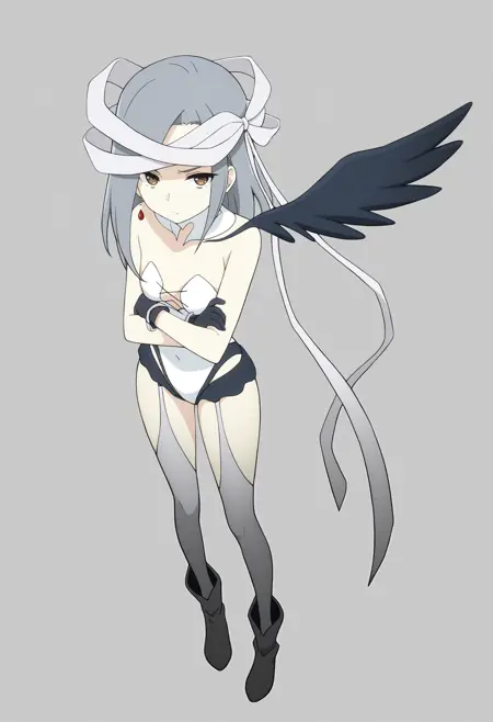 手套,过膝袜,翅膀,黑色翅膀,吊袜带,裸露肩膀,绷带,头部绷带,丝带,靴子,灰色靴子