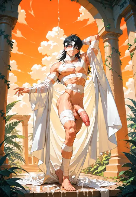 mummy, white body bandages, leg bandages, arm bandages, face bandages, flowing wind blown robe, see-through robe, transparent robe,