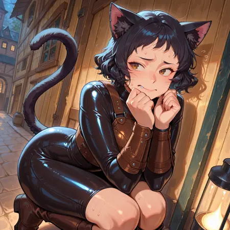 -Lila_Illust, Lila, 1명의 소녀, 네코마타, 고양이 소녀, 검은 고양이 꼬리, 검은 고양이 귀, 수염, 동물 귀, 검은 동물 귀 털, 검은 머리, 곱슬머리, 단발, 갈색 눈