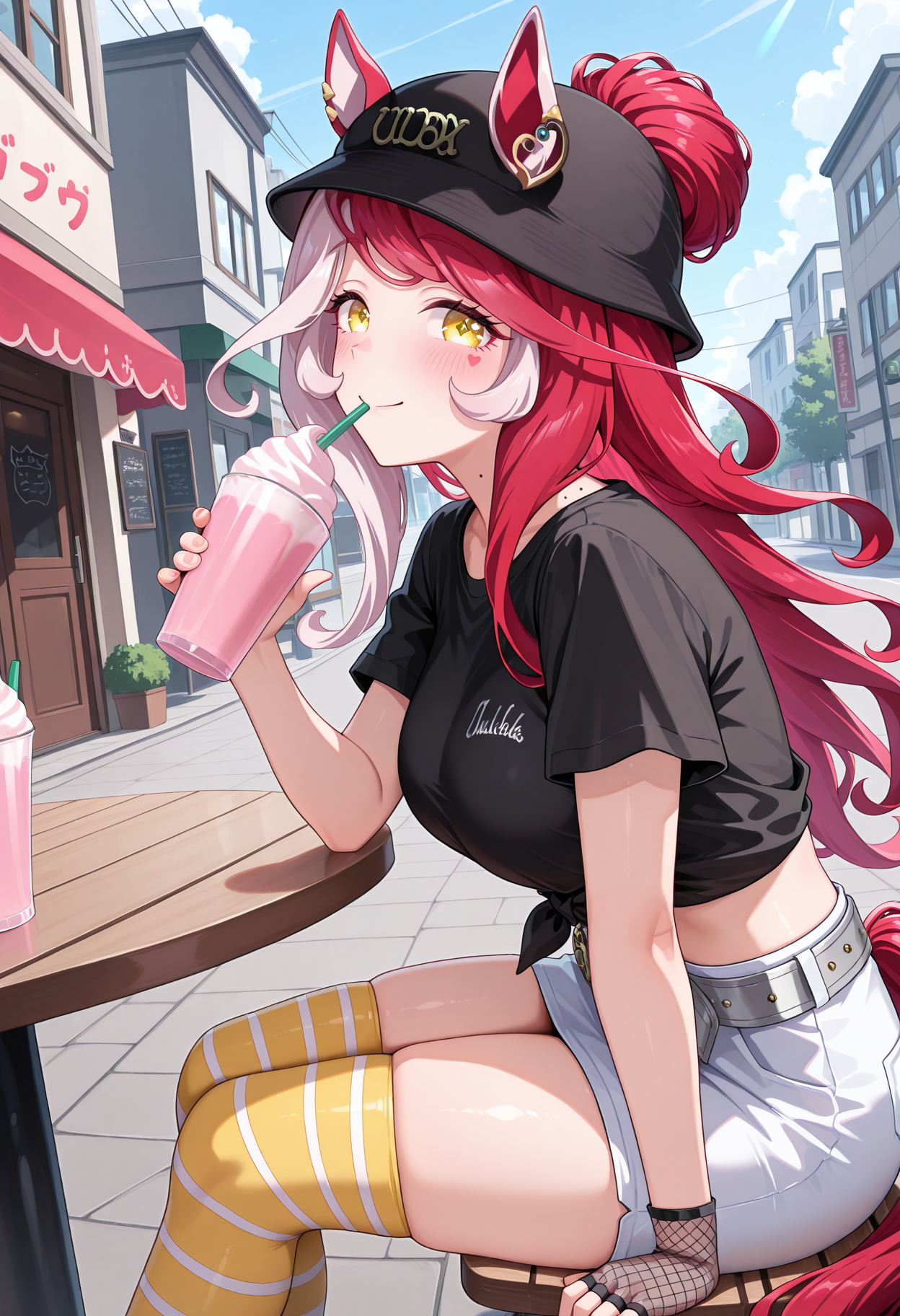 umalovey, horse girl, horse tail, long hair, multicolored hair, red hair, white hair, hair bun, yellow eyes, diamond-shaped pupils, heart in eyes, mole on neck, heart sticker, sticker on face, ear ornament,