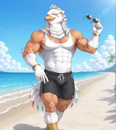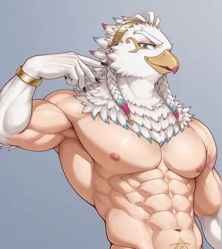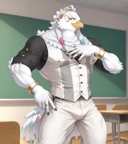 권장 프롬프트: "흰 손, 조류, 흰 무릎, 새 발, 탄 피부, 분홍색 눈"