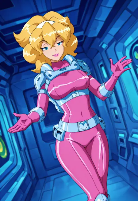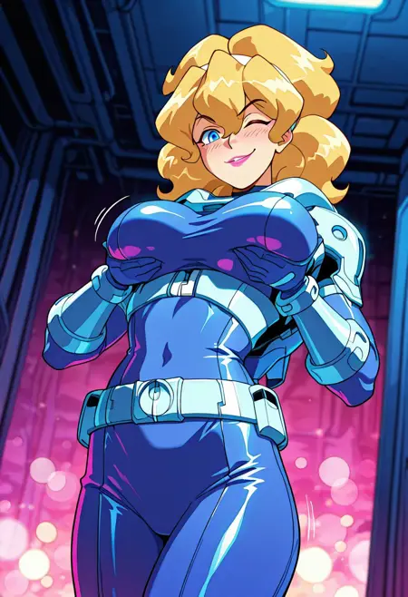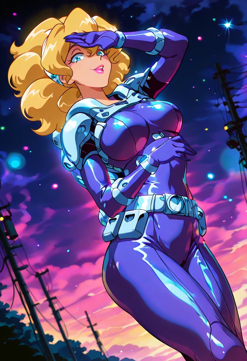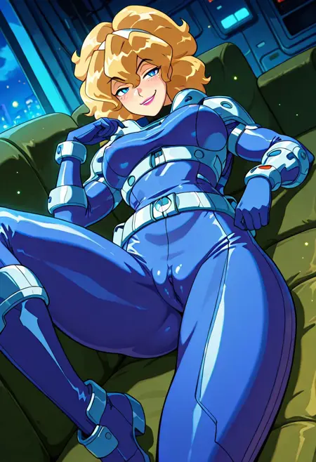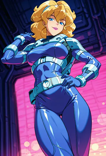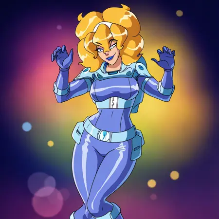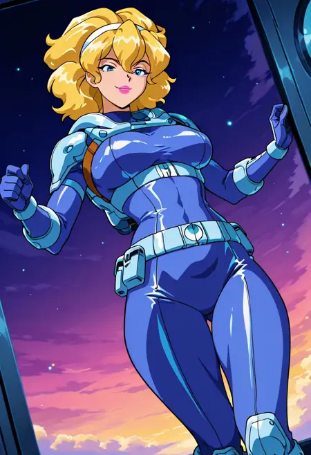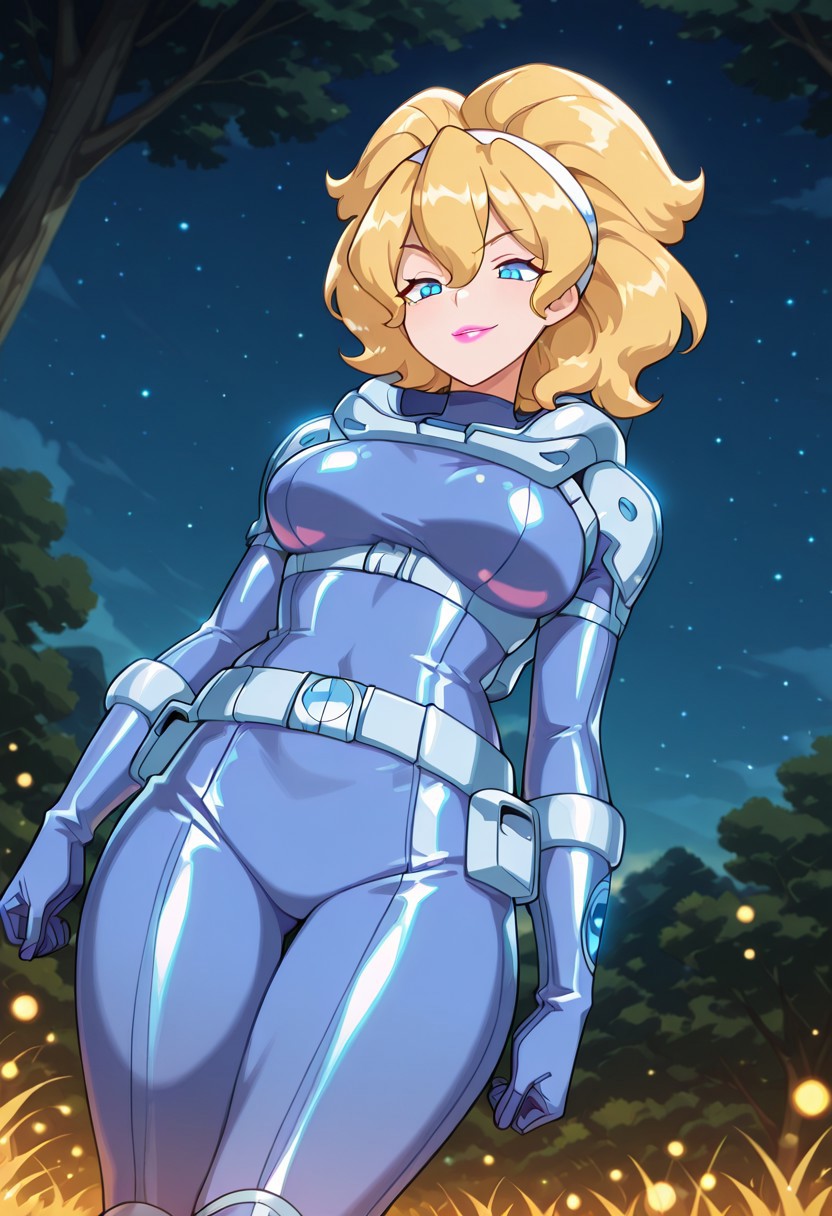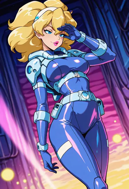 LadyLunaTS,1个女孩,单独,高个子女性,金色头发,浓密蓬松的头发,齐肩卷发,刘海,刘海遮住额头,白色发带配蓝色星星,蓝色眼睛,丰满的嘴唇,热粉红色口红,紫蓝色宇航服,喷气背包,腰带,盔甲,宽臀,大乳房,曲线优美的大腿,大屁股,靴子,手套,紧身衣,